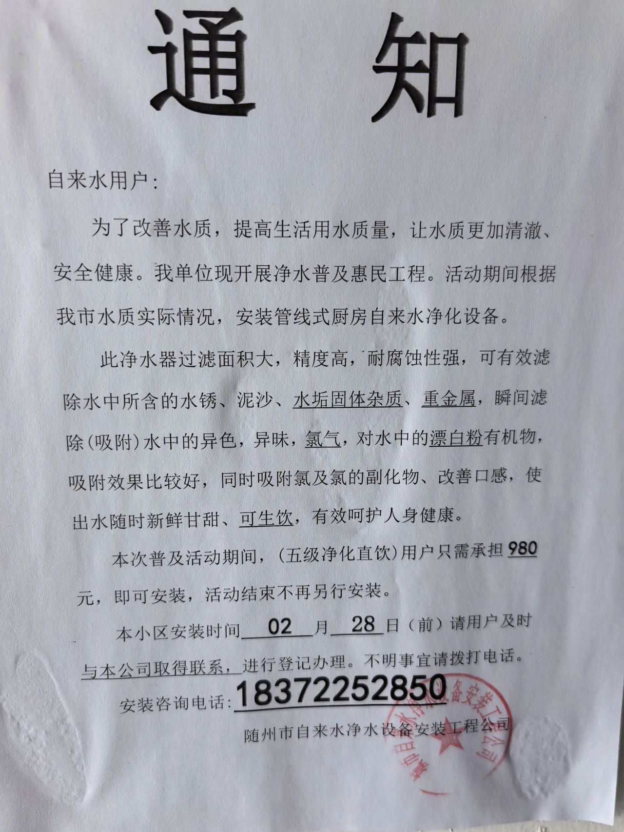 如發(fā)現(xiàn)以隨州市水務(wù)集團(tuán)有限公司或自來水廠名義推銷凈水器的人員請(qǐng)向我公司舉報(bào),我公司將依法追究法律責(zé)任。請(qǐng)廣大用戶提高警惕,切勿上當(dāng),如有疑問可直接撥打我公司24小時(shí)服務(wù)熱線0722-3318118進(jìn)行咨詢。